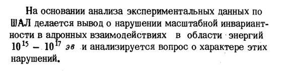 На основании анализа экспериментальных данных по ШАЛ делается вывод о нарушении масштабной инвариантности в адронных взаимодействиях в области энергий 1015 — 10 эв и анализируется вопрос о характере этих нарушений.