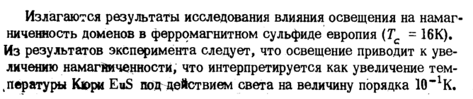 Излагаются результаты исследования влияния освещения на намаг-ничешюсть доменов в ферромагнитном сульфиде европия (Тс = 16К). Из результатов эксперимента следует, что освещение приводит к увеличению намагниченности, что интерпретируется как увеличение температуры Кк>ри EuS ποϊτ действием света на величину порядка 10 "1 К.