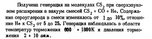 Получена генерация на молекулах CS2 при сверхзвуковом расширении в вакуум смесей CS2 + СО + Не. Содержание сероуглерода в смеси изменялось от 1 до 10%, отношение Не к CS 2 от 5 до 25. Генерация наблюдалась в области температур торможения 600. + 1800К и давления торможения 2+10 атм.