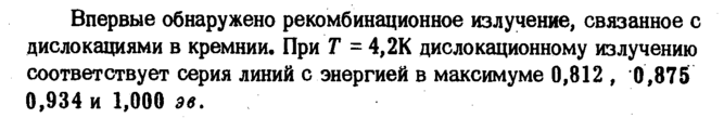 Впервые обнаружено рекомбинационное излучение, связанное с дислокациями в кремнии. При Τ = 4,2К дислокационному излучению соответствует серия линий с энергией в максимуме 0,812 , 0,875 0,934 и 1,000 эв.