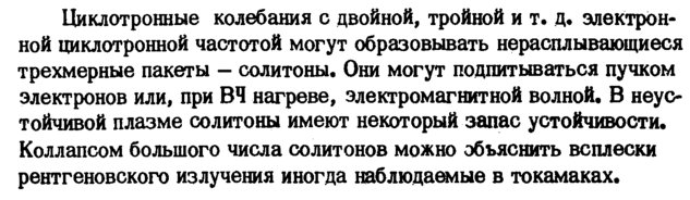 Циклотронные колебания с двойной, тройной и т. д. электронной циклотронной частотой могут образовывать нерасплывающиеся трехмерные пакеты солитоны. Они могут подпитываться пучком электронов или, при ВЧ нагреве, электромагнитной волной. В неустойчивой плазме солитоны имеют некоторый запас устойчивости. Коллапсом большого числа солитонов можно объяснить всплески рентгеновского излучения иногда наблюдаемые в токамаках.