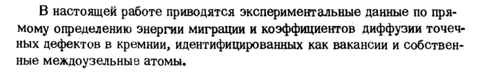 В настоящей работе приводятся экспериментальные данные по прямому определению энергии миграции и коэффициентов диффузии точечных дефектов в кремнии, идентифицированных как вакансии и собственные междоузельные атомы.