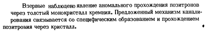 Впервые наблюдено явление аномального прохождения позитронов через толстый монокристалл кремния. Предложенный механизм канали рования связывается со специфическим образованием и прохождением позитрония через кристалл.