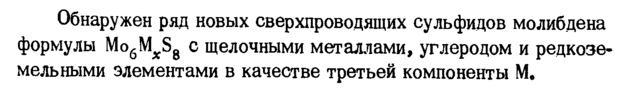 Обнаружен ряд новых сверхпроводящих сульфидов молибдена формулы Mo6MxS8 с щелочными металлами, углеродом и редкоземельными элементами в качестве третьей компоненты М.