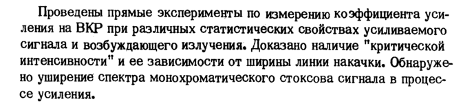 Проведены прямые эксперименты по измерению коэффициента усиления на ВКР при различных статистических свойствах усиливаемого сигнала и возбуждающего излучения. Доказано наличие "критической интенсивности" и ее зависимости от ширины линии накачки. Обнаружено уширение спектра монохроматического стоксова сигнала в процессе усиления.