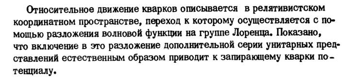 Относительное движение кварков описывается в релятивистском координатном пространстве, переход к которому осуществляется с помощью разложения волновой функции на группе Лоренца. Показано, что включение в это разложение дополнительной серии унитарных пред* ставлений естественным образом приводит к запирающему кварки по тенциалу.