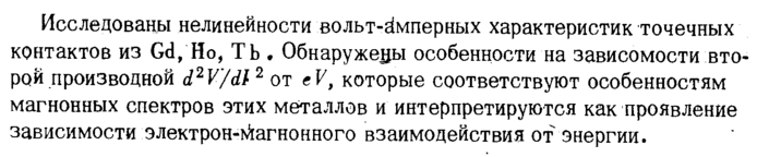Исследованы нелинейности вольт-амперных характеристик точечных контактов из Gd,Ho, ТЬ. Обнаружены особенности на зависомости второй производной d2V'/dl2 от eV, которые соответствуют особенностям магнонных спектров этих металлов и интерпретируются как проявление зависимости электрон-^агнонного взаимодействия от энергии.