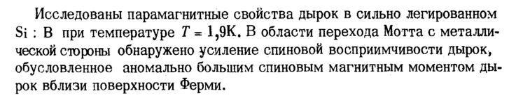 Исследованы парамагнитные свойства дырок в сильно легированном Si : В при температуре Τ = 1,9К. В области перехода Мотта с металлической стороны обнаружено усиление спиновой восприимчивости дырок, обусловленное аномально большим спиновым магнитным моментом ды рок вблизи поверхности Ферми.