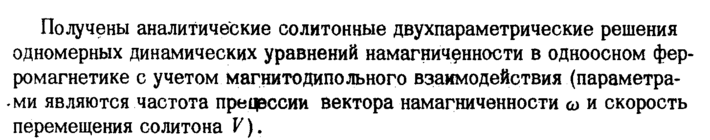 Получены аналитические солитонные двухпараметрические решения одномерных динамических уравнений намагниченности в одноосном ферромагнетике с учетом магнитодипольного взаимодействия (параметрами являются частота прецессии вектора намагниченности ω и скорость перемещения солитона V).