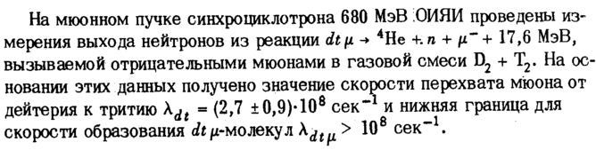 На мюонном пучке синхроциклотрона 680 МэВ ;ОИЯИ проведены измерения выхода нейтронов из реакции it μ -> 4Не +. η + μ" + 17,6 МэВ, вызываемой отрицательными мюонами в газовой смеси D2 + Т2. На основании этих данных получено значение скорости перехвата мюона от дейтерия к тритию \dt (2,7 ±0,9)·108 сек*1 и нижняя граница для скорости образования Ж/х-молекул Xdtfl > 108 сек*1.