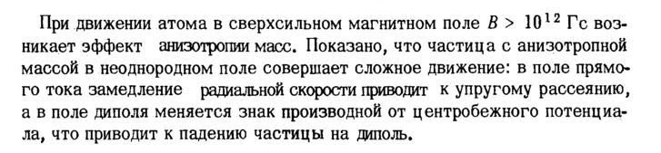 При движении атома в сверхсильном магнитном поле β > 1012 Гс возникает эффект анизотропии масс. Показано, что частица с анизотропной массой в неоднородном поле совершает сложное движение: в поле прямого тока замедление радиальной скорости приводит к упругому рассеянию, а в поле диполя меняется знак производной от центробежного потенциала, что приводит к падению частицы на диполь.