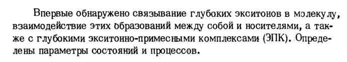 Впервые обнаружено связывание глубоких экситонов в молекулу, взаимодействие этих Образований между собой и носителями, а также с глубокими экситонно-примесными комплексами (ЭПК). Определены параметры состояний и процессов.