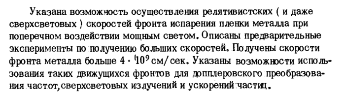 Указана возможность осуществления релятивистских ( и даже сверхсветовых ) скоростей фронта испарения пленки металла при поперечном воздействии мощным светом. Описаны предварительные эксперименты по получению больших скоростей. Получены скорости фронта металла больше 4 · '109см/сек. Указаны возможности использования таких движущихся фронтов для допплеровского преобразования частот, сверхсветовых излучений и ускорений частиц.
