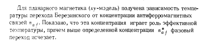 Для планарного магнетика (.ху-мэдель) получена зависимость темпе* ратуры перехода Березинского от концентрации антиферромагнитных связей па f, Показано, что эта концентрация играет роль эффективной температуры, причем выше определенной концентрации я*у фазовый переход исчезает,