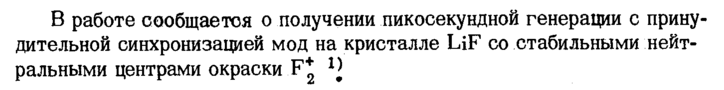 В работе сообщается о получении пикосекундной генерации с принудительной синхронизацией мод на кристалле LiF со стабильными нейтральными центрами окраски F* г1