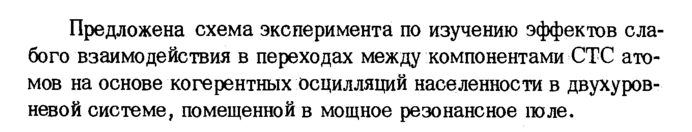 Предложена схема эксперимента по изучению эффектов слабого взаимодействия в переходах между компонентами СТС атомов на основе когерентных осцилляций населенности в двухуровневой системе, помещенной в мощное резонансное поле.