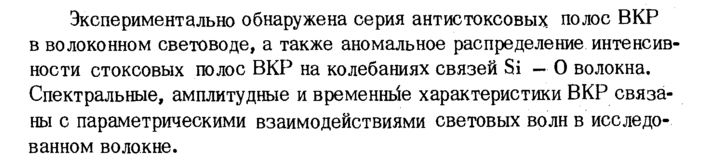 Экспериментально обнаружена серия антистоксовых, полос ВКР в волоконном световоде, а также аномальное распределение интенсивности стоксовых полос ВКР на колебаниях связей Si — О волокна. Спектральные, амплитудные и временные характеристики ВКР связаны с параметрическими взаимодействиями световых волн в исследованном волокне.