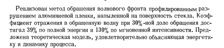 Реализован метод обращения волнового фронта профилированным разрушением алюминиевой пленки, напыленной на поверхность стекла. Коэффициент отражения в обращенную волну при 30%-ной доле обращения достигал 39% по полной энергии и 130% по мгновенной интенсивности. Предложена теоретическая модель, удовлетворительно объясняющая энергетику и динамику процесса.