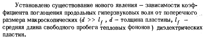 Установлено существование нового явления зависимости коэффициента поглощения продольных гиперзвуковых волн от поперечного размера макроскопических (d >> 1^ , d толщина пластины, /у -средняя длина свободного пробега тепловых фононов ) диэлектрических пластин.