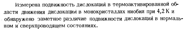Измерена подвижность дислокаций в термоактивированной области движения дислокаций в монокристаллах ниобия при 4,2 К и обнаружено заметное различие подвижности дислокаций в нормальном и сверхпроводящем состояниях»