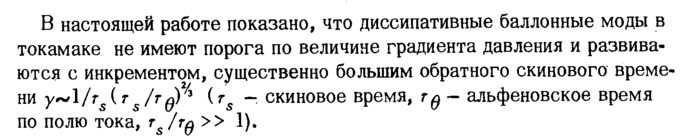 В настоящей работе показано, что диссипативные баллонные моды в токамаке не имеют порога по величине градиента давления и развиваются с инкрементом, существенно большим обратного скинового времени у~ЛД5( τ s /τβ)3 (rs скиновое время, tq альфеновское время по полю тока, τ&/τβ» 1)·