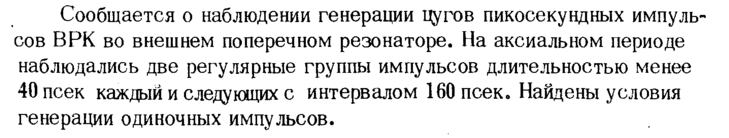 Сообщается о наблюдении генерации цугов пикосекундных импульсов ВРК во внешнем поперечном резонаторе. На аксиальном периоде наблюдались две регулярные группы импульсов длительностью менее 40псек каждый и следующих с интервалом 160 псек. Найдены условия генерации одиночных импульсов.