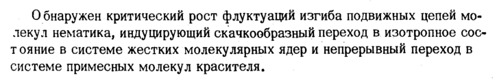 О бнаружен критический рост флуктуаций изгиба подвижных цепей молекул нематика, индуцирующий скачкообразный переход в изотропное сос-т ояние в системе жестких молекулярных ядер и непрерывный переход в системе примесных молекул красителя.