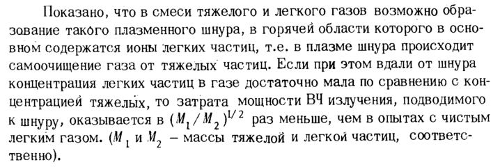 Показано, что в смеси тяжелого и легкого газов возможно образование такого плазменного шнура, в горячей области которого в основном содержатся ионы легких частиц, т.е. в плазме шнура происходит самоочищение газа от тяжелых частиц. Если при этом вдали от шнура концентрация легких частиц в газе достаточно мала по сравнению с концентрацией тяжелых, то затрата мощности ВЧ излучения, подводимого к шнуру, оказывается в (М1/М2 )1/2 раз меньше, чем в опытах с чистым легким газом. (Μ { и М2 массы тяжелой и легкой частиц, соответственно).