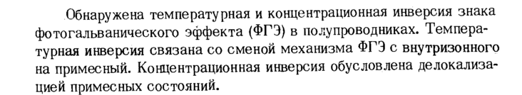 Обнаружена температурная и концентрационная инверсия знака фотогальванического эффекта (ФГЭ) в полупроводниках. Температурная инверсия связана со сменой механизма ФГЭ с внутризонного на примесный. Концентрационная инверсия обусловлена делокализа-цией примесных состояний.