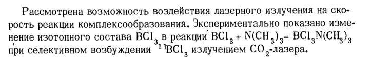 Рассмотрена возможность воздействия лазерного излучения на скорость реакции комплексообразования. Экспериментально показано изменение изотопного состава ВС13 в реакции BG13 + .N(CH3)3= BCl3N(CHg)3 при селективном возбуждении ПВС13 излучением С02-лазера.