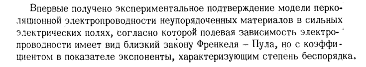Впервые получено экспериментальное подтверждение модели перко-ляционной электропроводности неупорядоченных материалов в сильных электрических полях, согласно которой полевая зависимость электро' проводности имеет вид близкий закону Френкеля Пула, но с коэффициентом в показателе экспоненты, характеризующим степень беспорядка.
