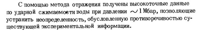 С помощью метода отражения получены высокоточные данные по ударной сжимаемоети воды при давлении ^1Мбар, позволяющие устранить неопределенность, обусловленную противоречивостью существующей экспериментальной информации.