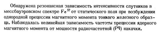 Обнаружена резонансная зависимость интенсивности спутников в мессбауэровском спектре Fe 57 от статического поля при возбуждении однородной прецессии магнитного момента тонкого железного образца. Наблюдалась нелинейная зависимость частоты прецессии ядерного магнитного момента от мощности радиочастотной (РЧ) накачки.