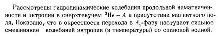 Рассмотрены гидродинамические колебания продольной намагниченности и энтропии в сверхтекучем 3Не А в присутствии магнитного поля. Показано,что в окрестности перехода в /^-фазу наступает сильное смешивание колебаний энтропии (и температуры) со спиновой волной.