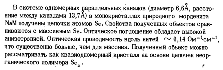 В системе одномерных параллельных каналов (диаметр 6,6А, расстояние между каналами 13,7А) в монокристаллах природного морденита NaM получены цепочки атомов Se. Свойства полученных объектов сравниваются с массивным Se. Оптическое поглощение обладает высокой анизотропией. Оптическая проводимость вдоль нитей ~ 0,14 Ом^-см""1, что существенно больше, чем для массива. Полученный объект можно рассматривать как квазиодномерный кристалл на основе цепочек неорганического полимера Sex.