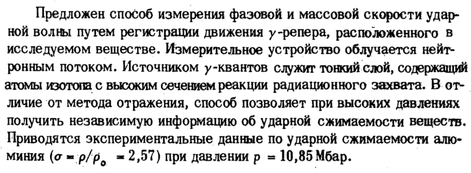 Предложен способ измерения фазовой и массовой скорости ударной волны путем регистрации движения у-репера, расположенного в исследуемом веществе. Измерительное устройство облучается нейтронным потоком. Источником у-квантов служит тонкий слой, содержащий атомы изотопа с высоким сечением реакции радиационного захвата. В отличие от метода отражения, способ позволяет при высоких давлениях получить независимую информацию об ударной сжимаемости веществ. Приводятся экспериментальные данные по ударной сжимаемости алюминия (σ ρ/ρ0 2,57) при давлении ρ = 10,85Мбар.