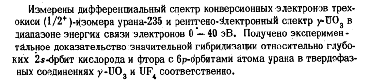 Измерены дифференциальный спектр конверсионных электронов трех-окиси (1/2* )-изомера урана-235 и рентгено-э'лектронный спектр у-003 в диапазоне энергии связи электронов 0 40 эВ. Получено экспериментальное доказательство значительной гибридизации относительно глубоких 2$-фбит кислорода и фтора с бр-брбитами атома урана в твердофазных соединениях y-U03 и UF4 соответственно.