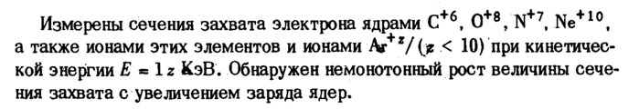 Измерены сечения захвата электрона ядрами С+6, 0+8, N+7, Ne+10f а также ионами этих элементов и ионами Ar+V < 10) при кинетической энергии Ε = lz КэВ. Обнаружен немонотонный рост величины сечения захвата с увеличением заряда ядер.