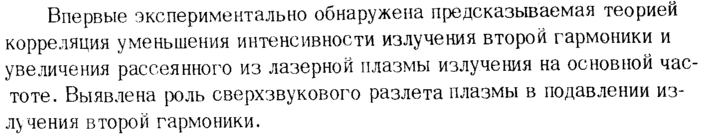 Впервые экспериментально обнаружена предсказываемая теорией корреляция уменьшения интенсивности излучения второй гармоники и увеличения рассеянного из лазерной плазмы излучения на основной частоте. Выявлена роль сверхзвукового разлета плазмы в подавлении излучения второй гармоники.