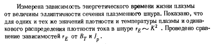 Измерена зависимость энергетического времени жизни плазмы от величины эллиптичности сечения плазменного шнура. Показано, что для одних и тех же значений плотности и температуры плазмы и одинакового распределения плотности тока в шнуре тЕ~ К2 . Проведено сравнение зависимостей г£ от Вт и J.