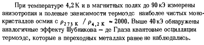 При температуре 4,2 К и в магнитных полях до 90 кЭ измерены анизотропия и полевые зависимости термоэдс наиболее чистых монокристаллов осмия с р273 к / рА 2К " 20°0. Выше 40кЭ обнаружены аналогичные эффекту Шубникова де Гааза квантовые осцилляции термоэдс, которые в переходных металлах ранее не наблюдались.