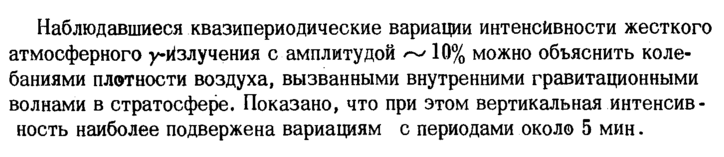 Наблюдавшиеся квазипериодические вариации интенсивности жесткого атмосферного уйзлучения с амплитудой ^10% можно объяснить колебаниями плотности воздуха, вызванными внутренними гравитационными волнами в стратосфере. Показано, что при этом вертикальная интенсивность наиболее подвержена вариациям с периодами около 5 мин.