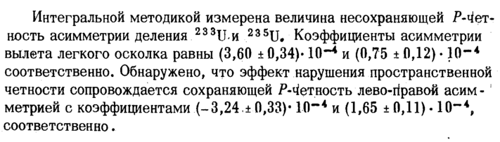 Интегральной методикой измерена величина несохраняющей Р-чет-ность асимметрии деления 233U-и 235U. Коэффициенты асимметрии вылета легкого осколка равны (3,60 ± 0,34)· 10"4 и (0,75 ± 0Д2) · 10"4 соответственно. Обнаружено, что эффект нарушения пространственной четности сопровождается сохраняющей Р-^етность лево-йравой асим1 метрией с коэффициентами (-3,24.± 0,33)· 10"4 и (1,65 ± 0,11) · 10~\ соответственно.
