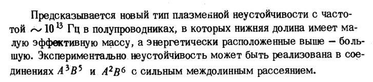 Предсказывается новый тип плазменной неустойчивости с частотой ~ 1013 Гц в полупроводниках, в которых нижняя долина имеет малую эффективную массу, а энергетически расположенные выше большую. Экспериментально неустойчивость может быть реализована в соединениях Л3В5 и А2В6 с сильным междолинным рассеянием.