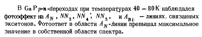 В Ga Ρ р-й переходах при температурах 40 — 80 К наблюдался фотоэффект на AN , №V8-, ΝΝΛ \ NN ъ, и ABV — линиях, связанных экситонов» Фотоответ в области AN-^инии превышал максимальное значение в собственной области спектра.