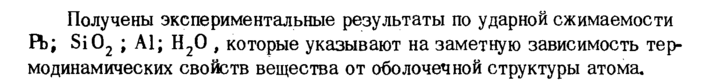 Получены экспериментальные результаты по ударной сжимаемости РЬ; Si02 ; ΑΙ; Н20 , которые указывают на заметную зависимость термодинамических свойств вещества от оболочечной структуры атома.