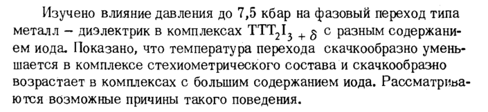 Изучено влияние давления до 7,5 кбар на фазовый переход типа металл диэлектрик в комплексах TTT2I3 + § с разным содержанием иода. Показано, что температура перехода скачкообразно уменьшается в комплексе стехиометрического состава и скачкообразно возрастает в комплексах с большим содержанием иода. Рассматри^а^ ются возможные причины такого поведения.