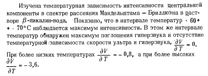 Изучена температурная зависимость интенсивности центральной компоненты в спектре рассеяния Мандельштама Бриллюэна в растворе β-пикалин-вода Показано, что в интервале температур »■ 60 + + < 70°С наблюдается максимум интенсивности. В этом же интервале температур обнаружен максимум поглощения гиперзвука и отсутствие температурной зависимости скорости ультра и гиперзвука, 'дУ ет д_ dV д Τ При более низких температурах= 0,8, а при более высоких дТ