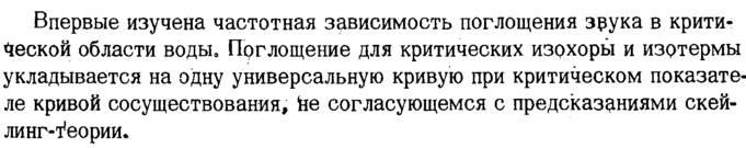 Впервые изучена частотная зависимость поглощения зрука в критической области водыа Поглощение для критических изохоры и изотермы укладывается на одну универсальную кривую при критическом показателе кривой сосуществования, be согласующемся с предсказаниями скей-линг-^еории.