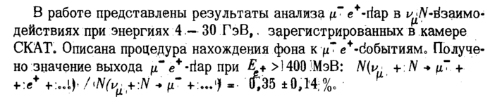 В работе представлены результаты анализу μ~ e+-rfap в 1^/У-йзаимо-действиях при энергиях 4,~ 30 ГэВ,, зарегистрированных в камере СКАТ. Описана процедура нахождения фона к μ" е+-(3обытиям0 Получено зцачение выхода μ- е+-riap при Е* > ] 400 !МэВ: N(u> + : /V μ" + + :е+ /</Vfy+:/V -> μ* + »■ (Γ,35 ±0,14;%